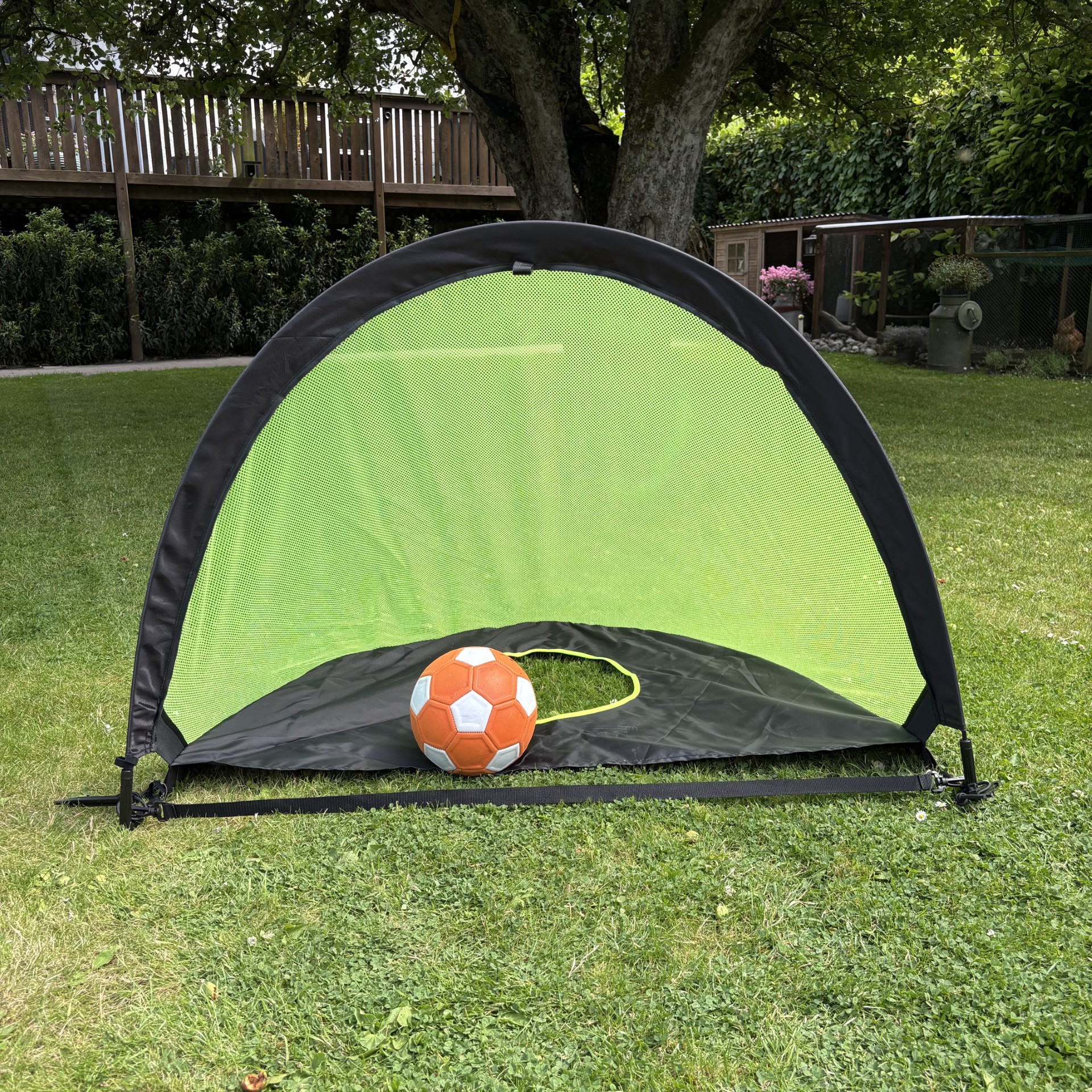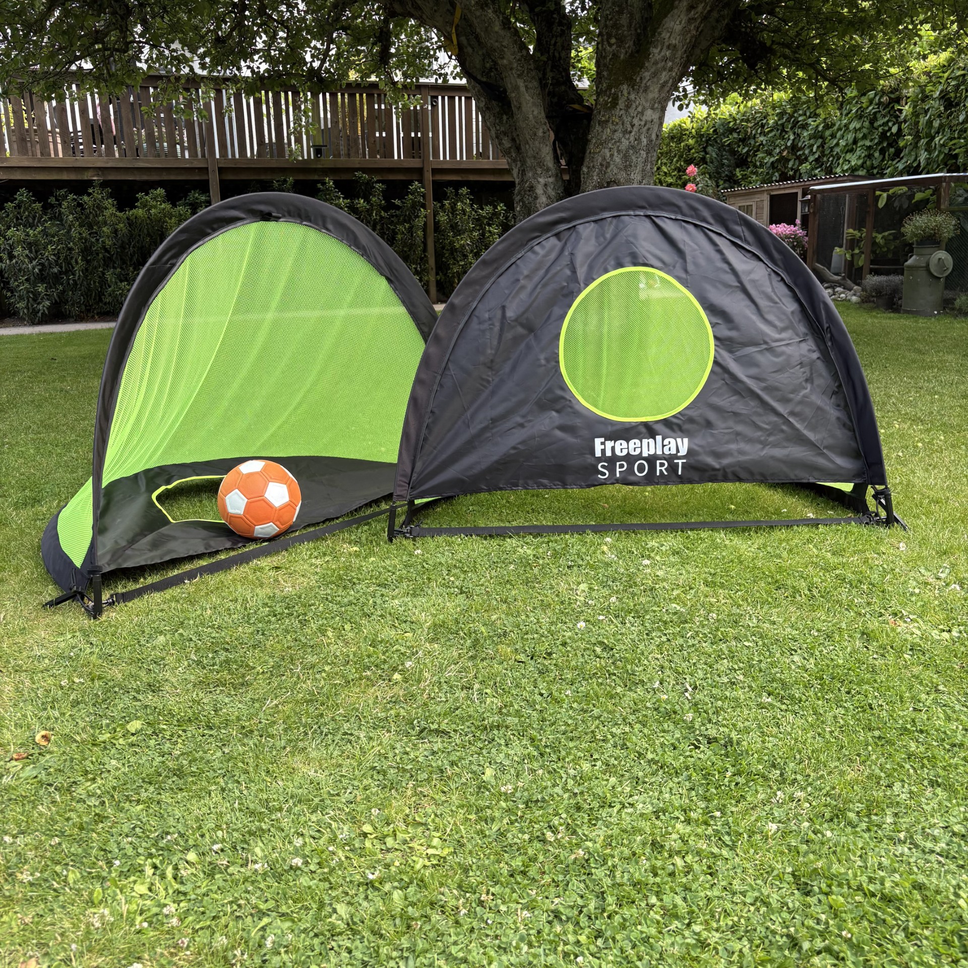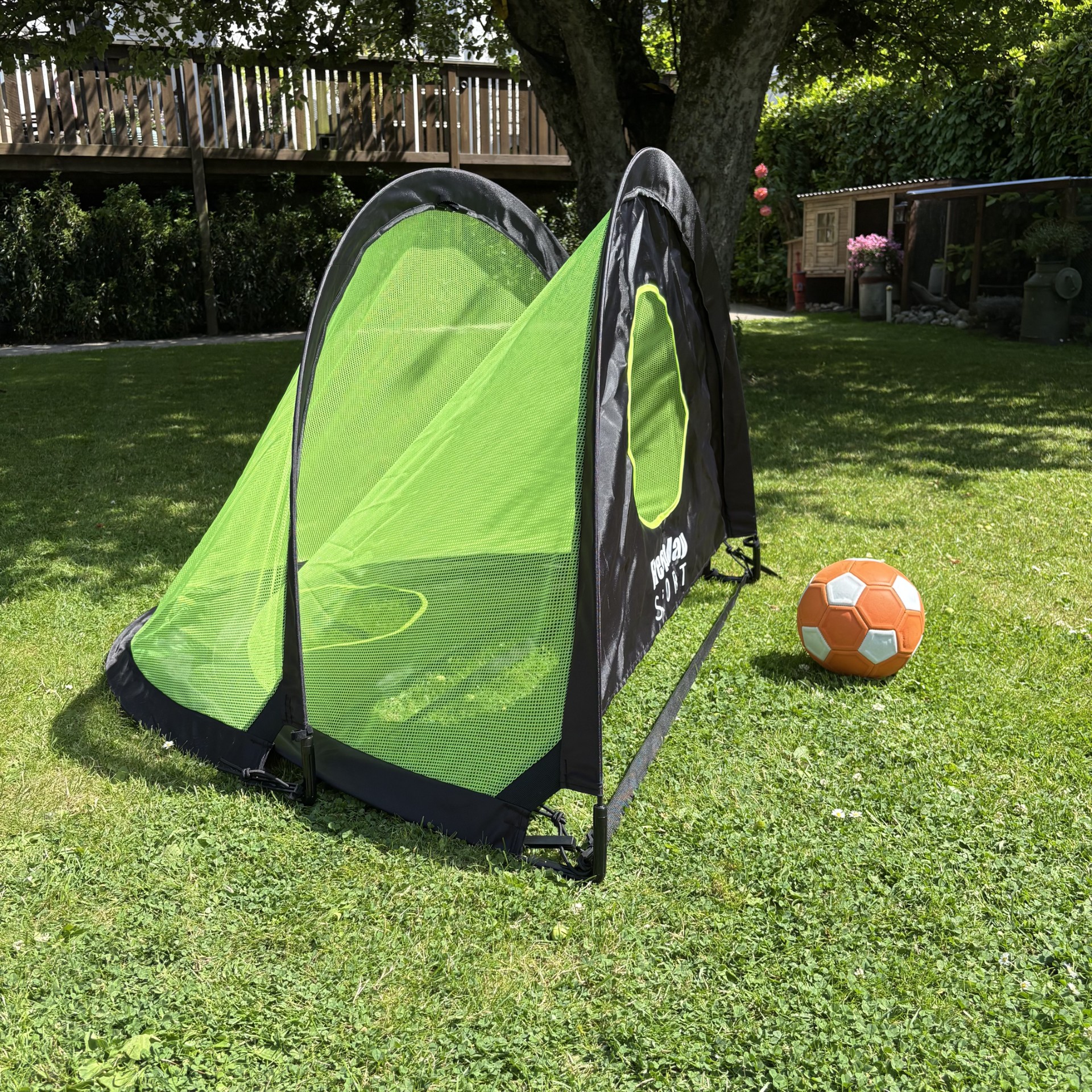 Med en størrelse på 116 cm (L) x 82 cm (D) x 82 cm (H) passer målene ideelt til haven, parken, stranden eller endda indendørs i større rum. Fodboldmålene kan tippes, så det er et alm. fodboldmål og et fodboldmål med skuddug. Tag spillet med dig – hvor som helst, når som helst.