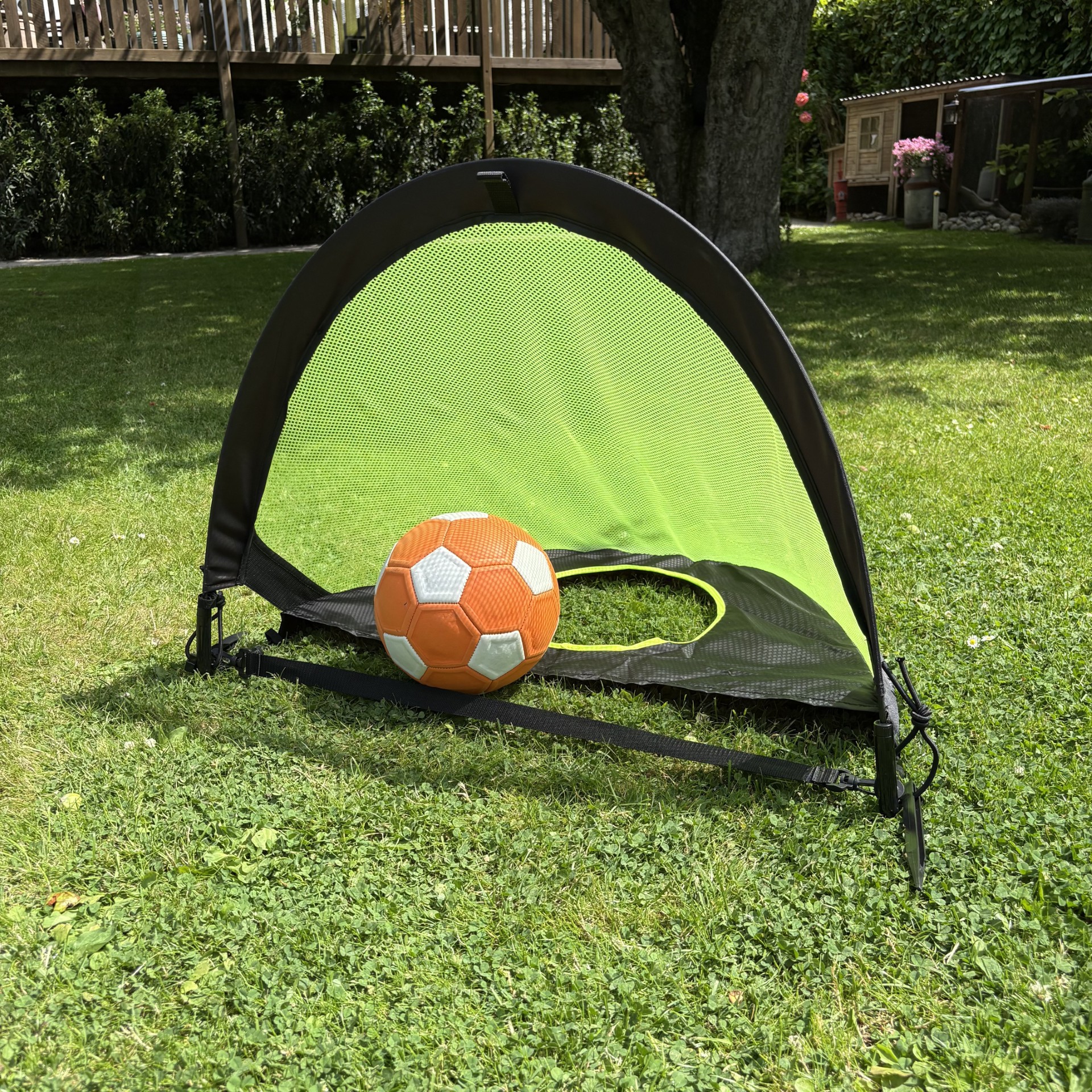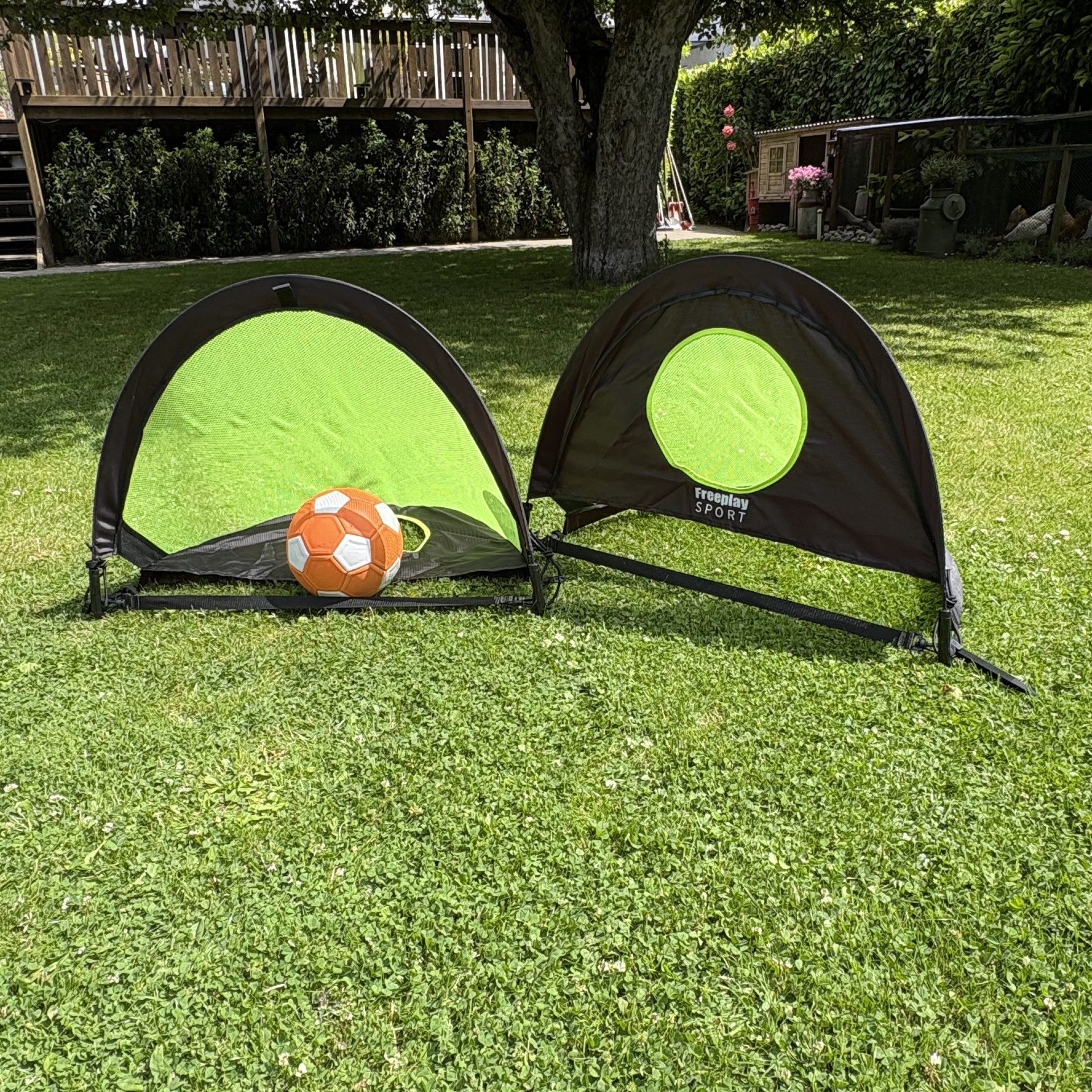 Med en størrelse på 80 cm (L) x 55 cm (D) x 55 cm (H) passer målene ideelt til haven, parken, stranden eller endda indendørs i større rum. Fodboldmålene kan tippes, så det er et alm. fodboldmål og et fodboldmål med skuddug. Tag spillet med dig – hvor som helst, når som helst.