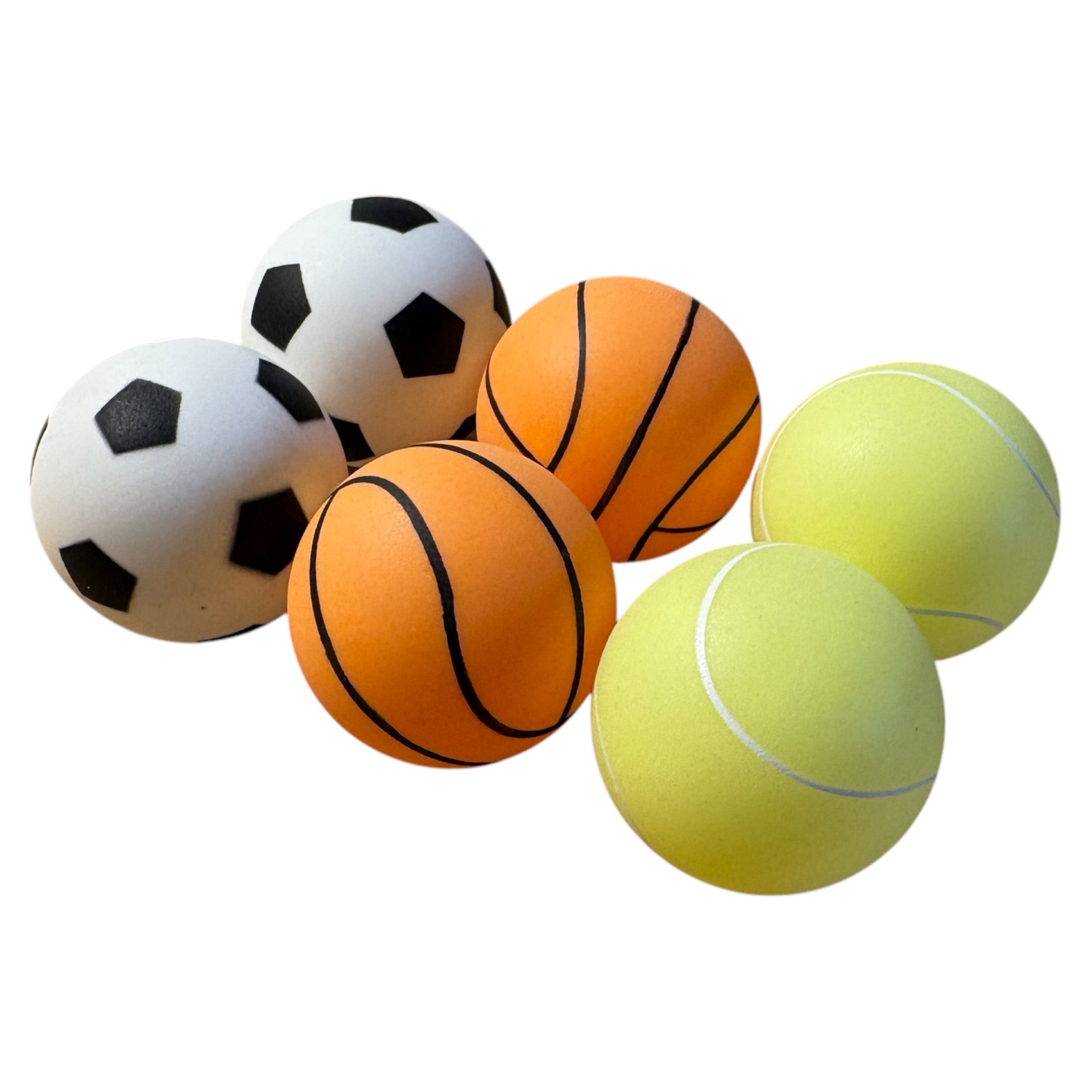 6 stk smart bordtennisbolde i plast som ligner miniudgaver af andre former for sportsbolde. Det er den helt almindelige størrelse bordtennisbolde. Dette smarte sæt med 6 stk bordtennisbolde i plastrør er nem at tage med til bordtennistræning eller til brug derhjemme på bordtennisbordet. Boldene har en diameter på 40 mm. Hvert sæt har to bolde med fodboldprint, to bolde med basketballprint og to bolde med tennisboldprint.