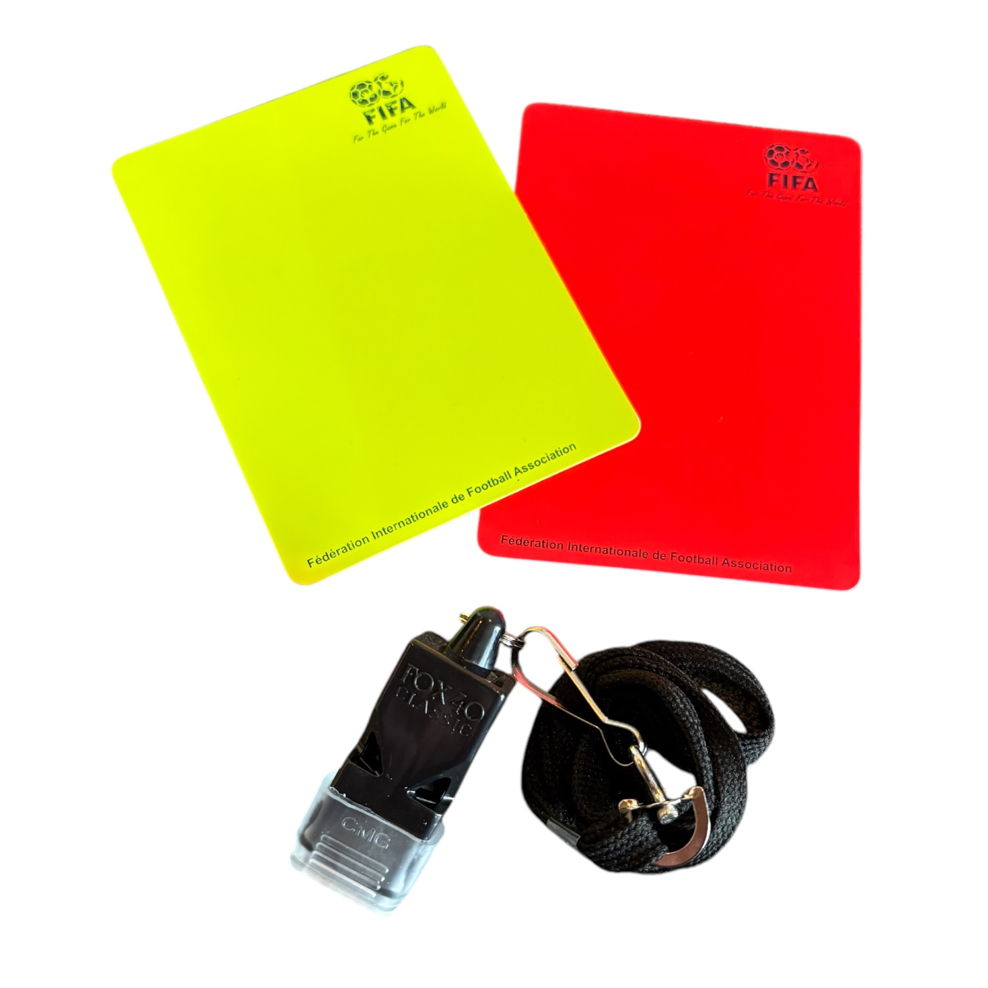 Skal fodboldkampen i haven blive lidt sjovere, så køb dette FIFA dommersæt med gult og orange kort samt FOX 40 fløjte med halssnor.